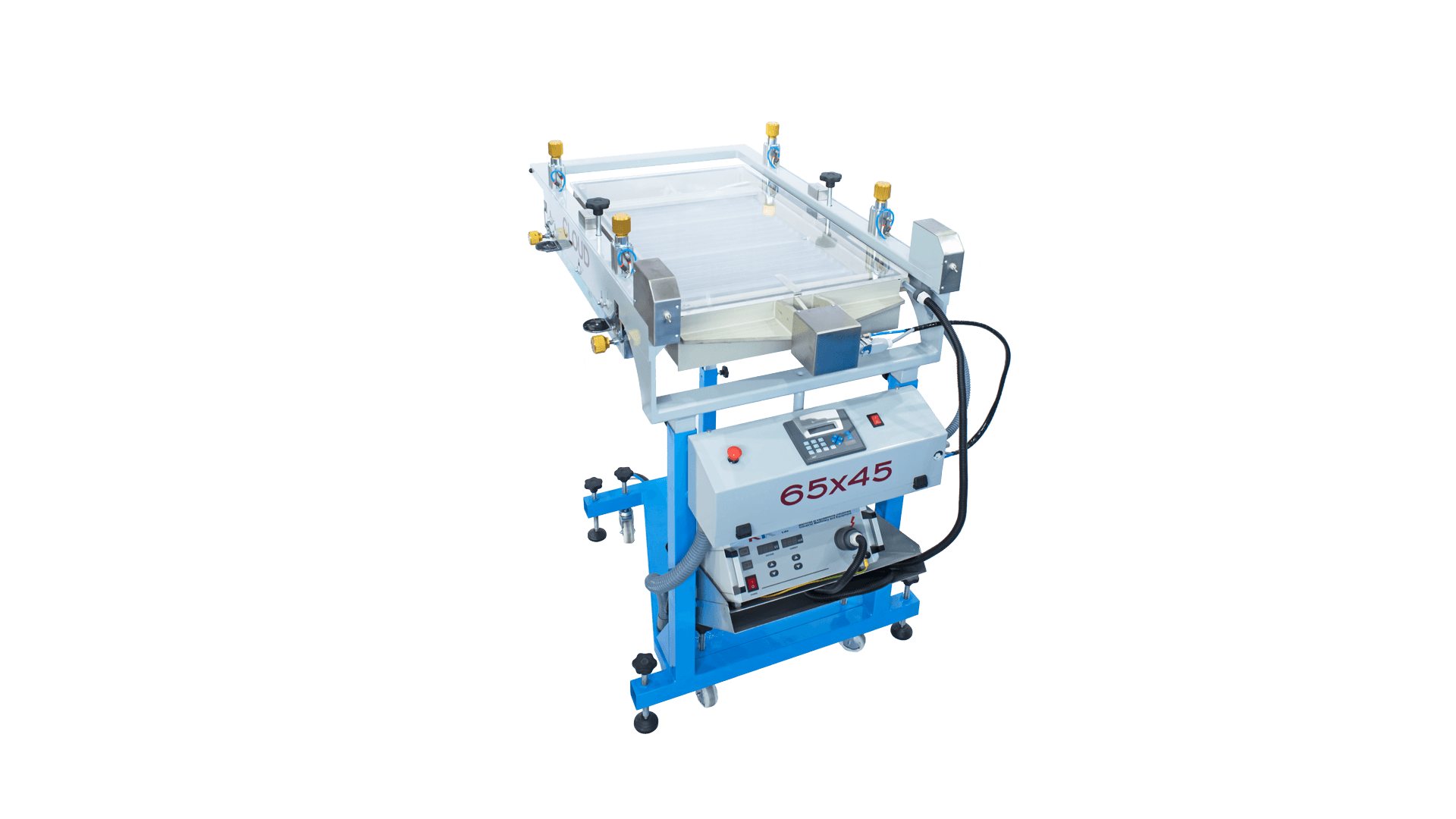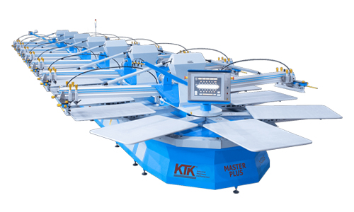 Con el sistema de elevación independiente de las cabezas de impresión, KTK consigue estampar con tintas de agua y plastisol sin cualquier tipo de esfuerzo, pues el estampador tiene la capacidad de dirigir el tiempo que los cuadros están en contacto con las paletas, que fueron previamente calentadas por el flash-cure
